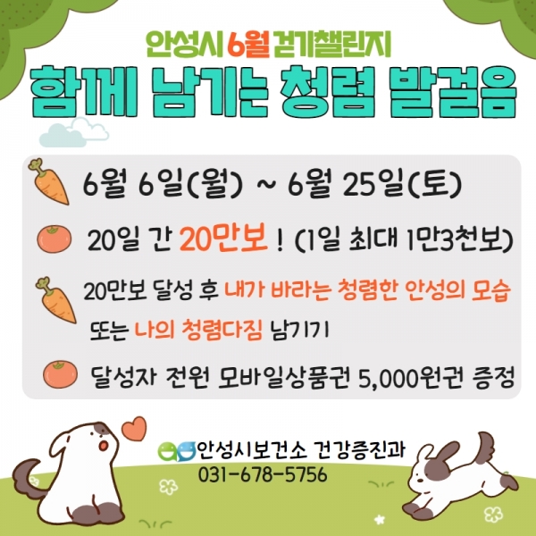 [충청뉴스큐] 안성시보건소는 이달 6일부터 25일까지 20일간 모바일 걷기 앱 ‘워크온’을 이용한 걷기 챌린지를 운영한다고 밝혔다.