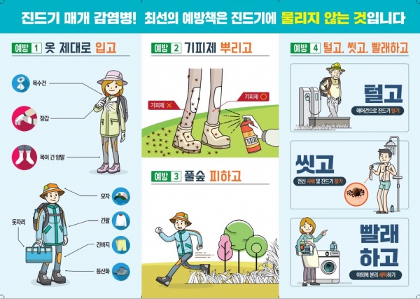 평택시 송탄보건소 관계자는 “야외활동 후 2주 이내 가피, 발열, 설사, 근육통 등의 증상이 있거나 진드기에 물렸을 경우에는 즉시 의료기관에 방문할 것”을 당부했다.