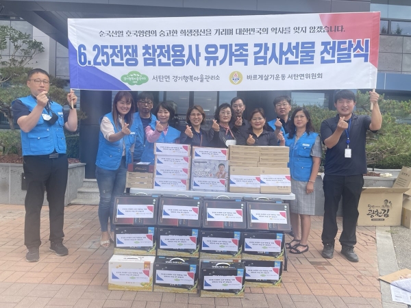 [충청뉴스큐] 평택시 서탄면 바르게살기운동위원회 및 경기행복마을관리소에서 7일 호국보훈의 달을 맞아 서탄면 지역 6.25 참전용사 유가족 27세대를 직접 방문해 감사물품을 전달해 드리며 국가를 위해 헌신한 노고에 존경과 감사의 뜻을 전했다고 밝혔다.