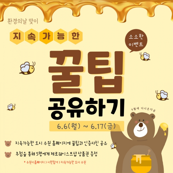 [충청뉴스큐] 수원시가 환경의 날을 맞아 6월 17일까지 ‘지속가능한 도시 수원’ 홈페이지에서 ‘지속가능한 꿀팁 공유하기’ 이벤트를 연다.