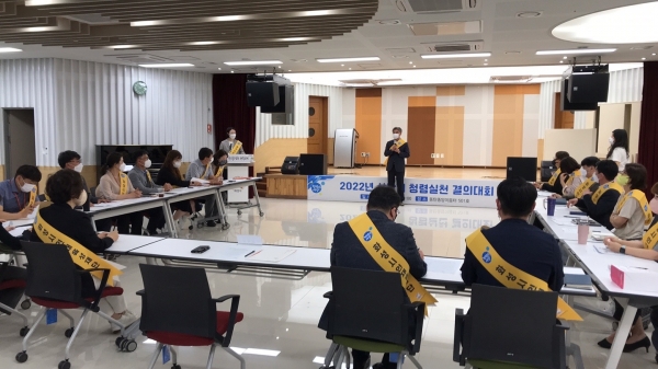 결의대회는 청렴실천리더 임명식 결의문 낭독 갑질근절 서약 청렴실천협의체 회의 순으로 진행됐으며 김태호 대표이사와 각 부서장 및 팀장 등 22명이 참석했다.
