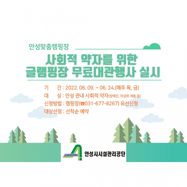[충청뉴스큐] 안성시시설관리공단에서 운영하는 안성맞춤캠핑장은 6월 휴장기간을 활용해 안성 관내 사회적 약자의 여가활동 기회를 제공하고자 글램핑장 무료 대관 행사를 실시한다고 밝혔다.