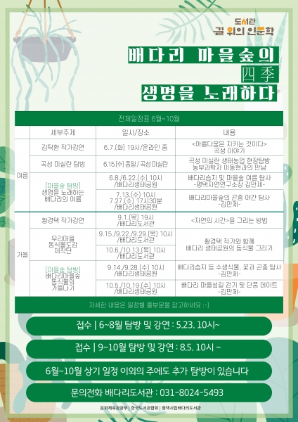 [충청뉴스큐] 평택시립배다리도서관은 문화체육관광부가 주최하고 한국도서관협회가 주관한 2022년 길 위의 인문학에 선정되어 ‘배다리 마을숲의 四季, 생명을 노래하다’라는 생태 인문학 프로그램을 운영한다.
