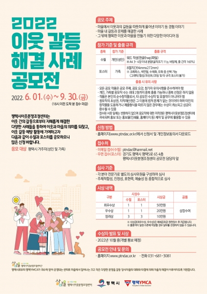 시에서는 2020년부터 이웃분쟁조정센터를 운영하고 있으며 공모전에 관한 질의 또는 이웃 간의 분쟁으로 상담이나 교육을 희망하는 시민은 평택시 이웃분쟁조정센터로 문의가 가능하다.