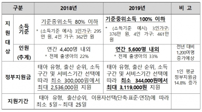 시는 이번 지원대상 확대를 통해 대상자가 약 1,200여 명 증가해 출산가정의 경제적 부담이 경감되고 관련 분야 일자리 종사자 수도 200여 명이 증가할 것으로 내다봤다. 정부지원금도 최소 34만4000원에서 최대 311만9000원이 지원되며 전년 대비 1인당 평균 정부지원금은 14.8% 증가할 전망이다.