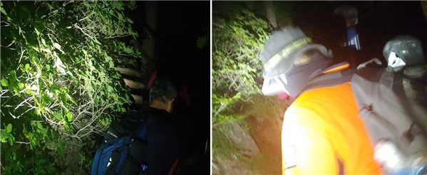 여성 구조대상자는 처음에는 부축으로 내려왔으나 시간이 지날수록 탈진의 정도가 심해 이민호 대원이 업고 내려왔으며 무릎 통증으로 보행이 어려운 남성 구조대상자는 김영수 대원이 부축하며 야간 하산을 했다.