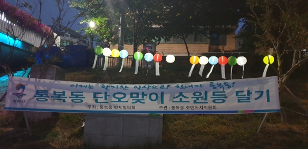 이는 지난 2일 단오를 맞아 평택시 통복동 8개 단체 회원들이 손수 설치한 것으로 소원등에는 코로나19로 힘들었던 일상에서 벗어나 활력이 넘치는 생활을 희망하는 평택 시민들을 응원하는 글, 개인적인 소망 등 200여 통복동 주민들의 마음을 담았다.
