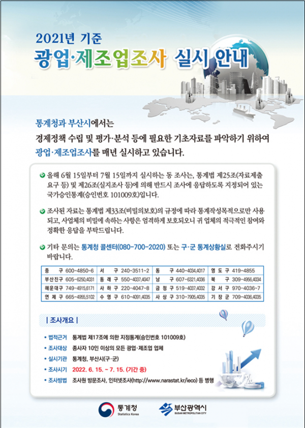 부산시 관계자는 “급변하는 경제·사회구조 변화에 대응한 각종 정책을 올바르게 수립하기 위해서는 정확한 통계자료가 필요하다”며 “정확한 조사를 위해 업체들의 적극적인 참여와 정확한 응답을 당부드린다”고 전했다.