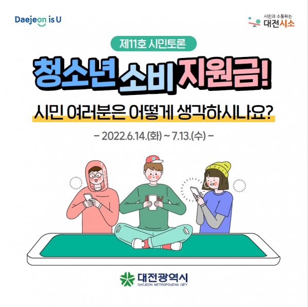 [충청뉴스큐] 대전시는 정책제안 플랫폼 ‘대전시소’에서 ‘청소년 소비 지원금, 시민여러분의 생각은 어떠신가요?’라는 주제로 6월 14일부터 한달 간 시민들의 다양한 의견을 수렴한다.