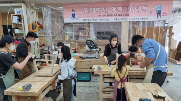 프로그램에 참여한 부모와 자녀는 ‘우리가정 행복한 다과상 만들기’란 제목으로 함께 목공 체험을 하며 그동안 부족했던 가족간의 대화와 유대감을 확인하는 시간을 가졌다.