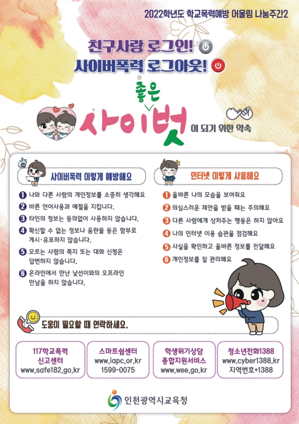 [충청뉴스큐] 인천광역시교육청은 17일까지 학교폭력예방 어울림 나눔주간2 캠페인 ‘친구사랑 로그인 사이버폭력 로그아웃’ 를 실시한다.