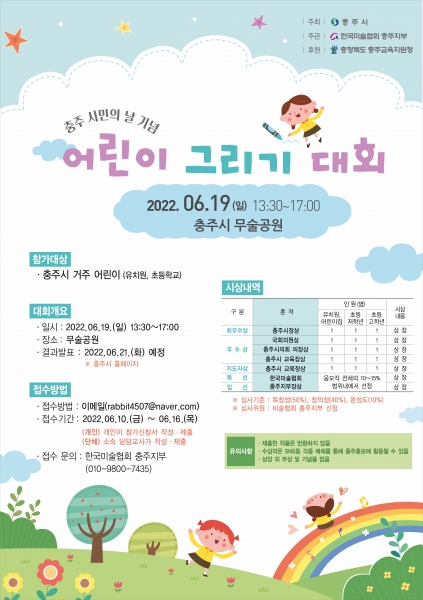 이번 대회 참가 대상은 충주에 거주하는 유치원생·초등학생이며 현장에서 나눠주는 도화지에 직접 가져온 그림 도구를 이용해 완성한 작품을 제출하는 방식으로 진행된다.