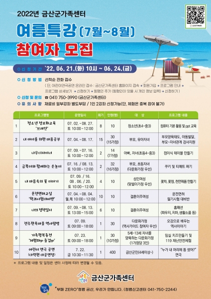[충청뉴스큐] 금산군은 금산군가족센터 여름특강 참여자를 오는 21일부터 24일까지 모집한다.