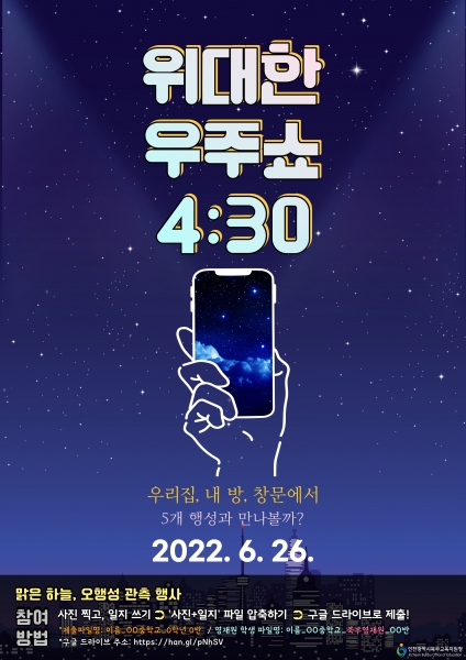 [충청뉴스큐] 인천북부교육지원청은 ‘2022 위대한 우주쇼, 내방 창문에서 5 행성 관측’ 행사를 실시한다고 16일 밝혔다.