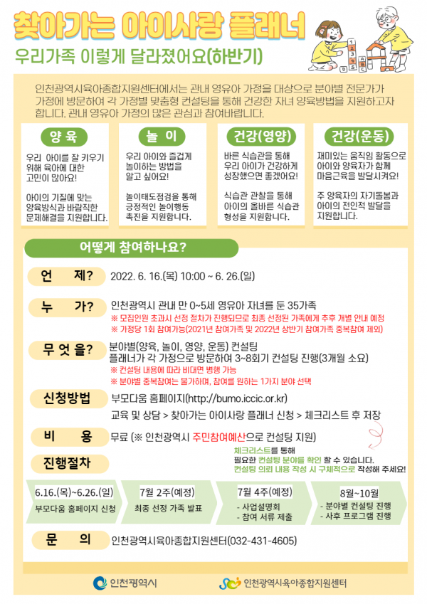 [충청뉴스큐] 양육 애로 등으로 힘든 영유아 양육 가정이라면 전문 상담사의 육아 컨설팅 도움을 받아보면 어떨까?인천광역시가 하반기 맞춤형 육아 컨설팅 사업인 ‘찾아가는 아이사랑 플래너’에 참여할 35가정을 모집한다.