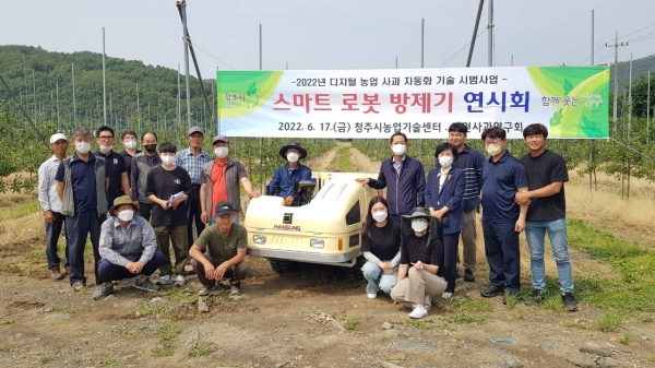 [충청뉴스큐] 청주시농업기술센터는 17일 상당구 미원면 계원리 사과밭에서 미원사과연구회, 농업기술센터 관계자 등 20여명과 함께 스마트 로봇 방제기 연시회를 가져 큰 호응을 얻었다.