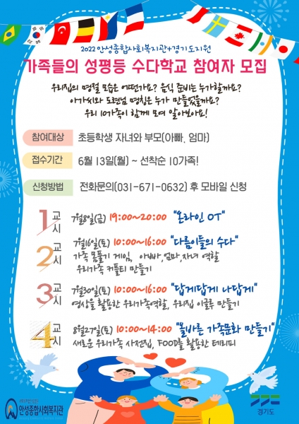 [충청뉴스큐] 안성종합사회복지관은 다음달 1일까지 초등학생 자녀와 부모를 대상으로 ‘가족들의 성평등 수다학교’ 프로그램 참여자를 모집하고 있다.