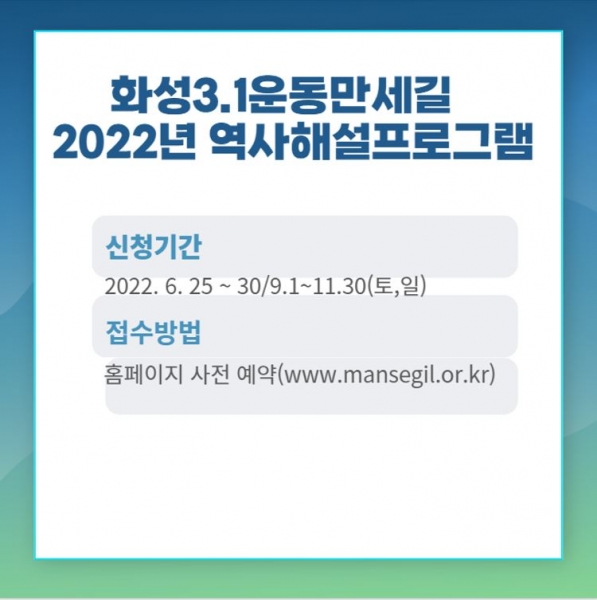 [충청뉴스큐] 화성시문화재단은 최근 사회적 거리두기 해제와 일상회복 흐름에 맞춰 현장에서 진행하는 ‘화성3·1운동만세길 역사해설프로그램을 6월 25일부터 30일까지, 9월 1일부터 11월 30일까지 주말에 운영한다.