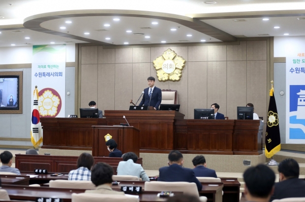 조석환 의장은 개회사를 통해 “지난 4년 동안 ‘수원시민의 행복 최우선’이라는 가치 실현을 위해 열정적으로 의정활동을 펼칠 수 있도록 아낌없는 관심과 성원을 보내주신 시민 여러분께 감사드린다”고 말했다.