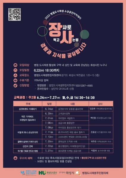모집대상은 병점 도시재생활성화구역 내 소상공인 또는 교육에 관심있는 화성 시민 15인이며 교육신청을 원하는 경우 QR코드 스캔 후 신청하면 된다.
