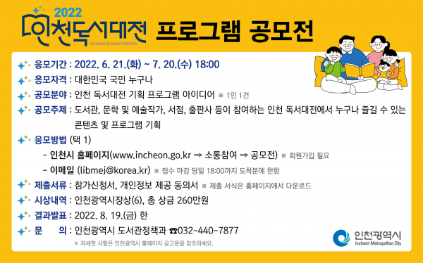 [충청뉴스큐] 인천광역시는 오는 9월에 열리는 ‘인천 독서대전’에 시민들이 프로그램을 직접 제안할 수 있는 ‘2022 인천 독서대전 프로그램 공모전’을 개최한다고 밝혔다.