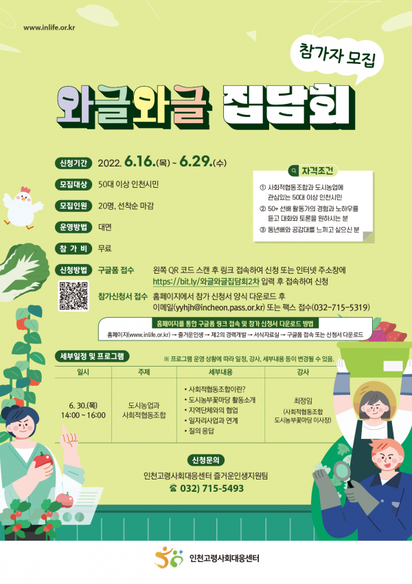 [충청뉴스큐] 인천시사회서비스원 인천시고령사회대응센터는 이달 말 ‘도시농업과 사회적협동조합’을 주제로 열리는 ‘와글와글 집담회’에 참여할 시민을 모집한다고 21일 밝혔다.