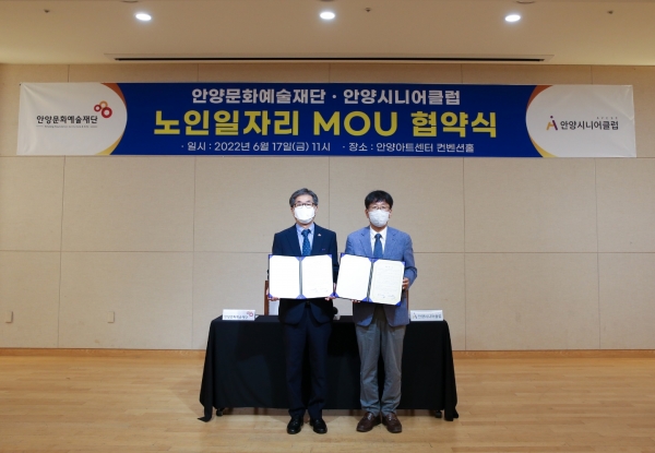 [충청뉴스큐] 안양시는 지난 17일 안양문화예술재단과 안양시니어클럽이 지역사회 복지 발전과 노인의 삶의 질 향상에 서로 협력할 것을 다짐하는 업무협약(MOU)을 체결했다고 20일 밝혔다.