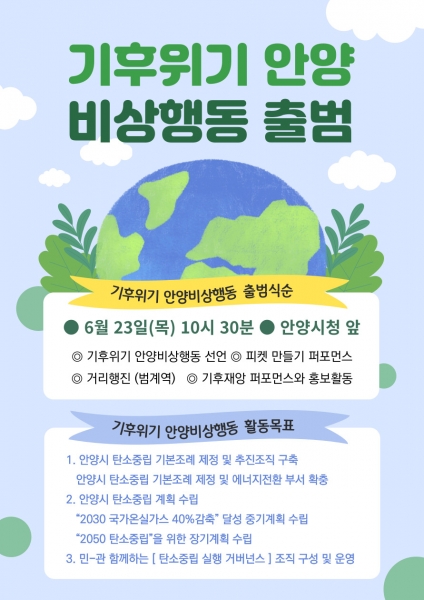 기후위기 안양비상행동 발족식은 6월 23일 오전 10시 30분 안양시청 앞 광장에서 진행할 예정이다.