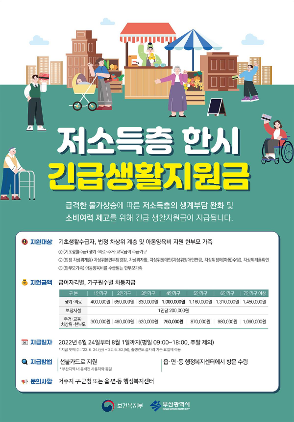 [충청뉴스큐] 부산시가 급격한 물가상승에 따른 저소득층의 생계부담 완화 및 소비 여력 제고를 위해 6월 24일부터 ‘저소득층 한시 긴급생활지원금’을 지급한다고 밝혔다.