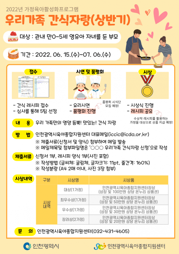 인천광역시는 각 가정의 우수 간식 레시피를 공모하는 프로그램, ‘우리 가족 간식자랑’을 실시한다고 밝혔다.