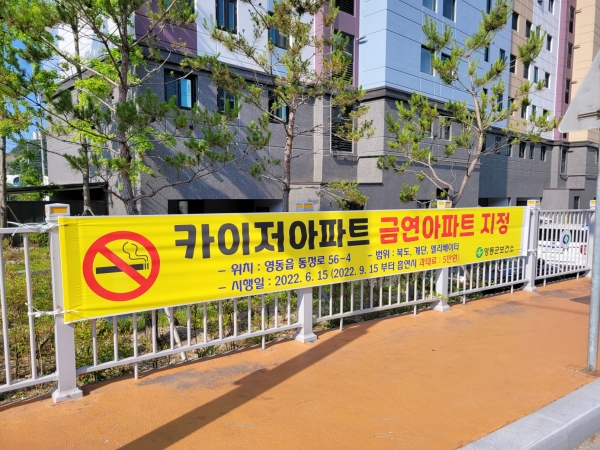 [충청뉴스큐] 충북 영동군은 영동군 공동주택 금연구역 제7호로 영동읍 동정리 카이저아파트를 지정했다고 밝혔다.