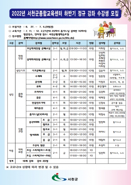 [충청뉴스큐] 서천군이 하반기 종합교육센터 정규강좌 수강생을 오는 27일부터 모집한다고 밝혔다.
