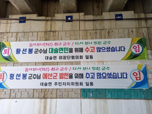 [충청뉴스큐] 황선봉 예산군수가 이달 말 퇴임을 앞둔 가운데 예산군 지역사회 곳곳에 내걸린 현수막들이 눈길을 끌고 있다.