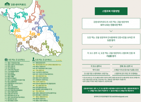 도 관계자는 “강원네이처로드 스탬프투어는 강원 관광도로를 더 재미있게 즐기고 강원도 구석구석을 여행할 수 있는 가이드라인이라고 할 수 있다”며 “스탬프투어 완주 후에도 인증사진과 기념품을 꺼내보며 즐거웠던 기억을 떠올릴 수 있는 추억이 담긴 강원도 여행을 즐기시기 바란다”고 전했다.