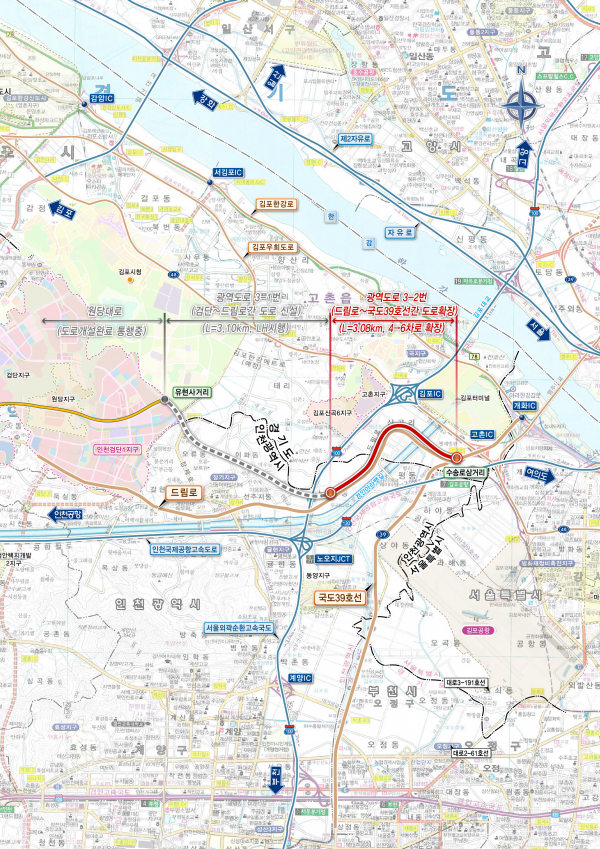 [충청뉴스큐] iH는 검단신도시 및 주변지역 주민들이 서울방향으로 통행시 김포고속화도로 또는 국도48호선을 경유하지 않고 직접 연결을 통해 서울축 도로의 교통소통 향상을 도모하기 위해 드림로 ~ 국도39호선 도로 확장공사를 6월 24일 착공한다고 밝혔다.