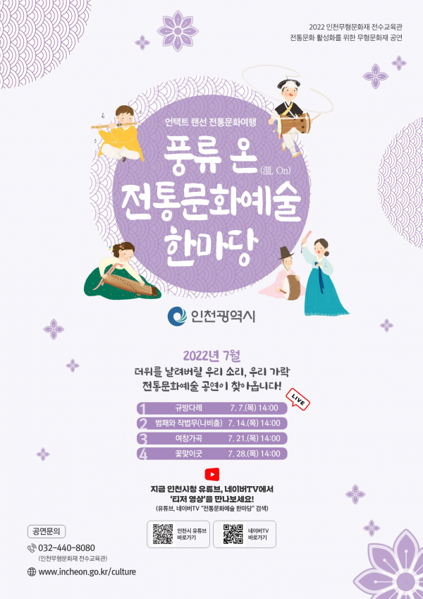 인천광역시는 인천무형문화재 전통문화 활성화 공연인 ‘2022년 풍류 온 전통문화 예술 한마당’을 오는 7월 7일 오후 2시, 인천시 유튜브 채널을 통해 첫 공개한다고 밝혔다.