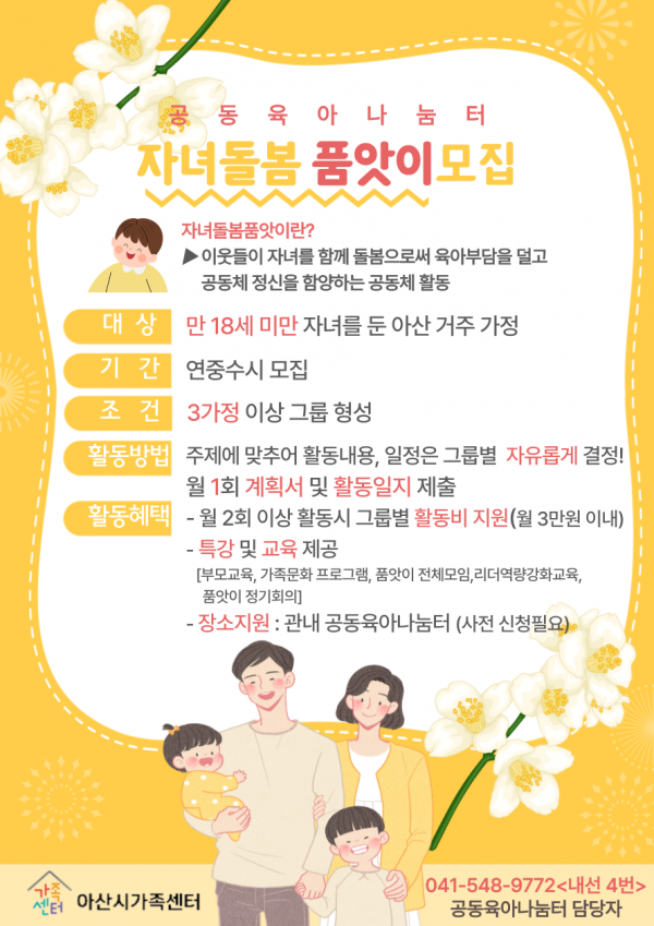 고분자 여성복지과장은 “공동육아나눔터 운영이 시민들의 육아 부담 경감에 일조하기를 바라며 앞으로도 다양한 프로그램 제공 및 돌봄 품앗이 지원으로 아이 키우기 좋은 도시 조성을 위해 지속 노력하겠다”고 말했다.