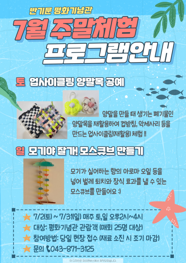 채수찬 평생학습과장은 “많은 분이 평화기념관에 방문해 주말 체험학습도 즐기고 다양한 전시도 관람하고 가시길 바라며 앞으로도 관람객들에게 다채로운 즐거움을 선사할 수 있도록 다양한 프로그램을 운영하겠다”고 말했다.