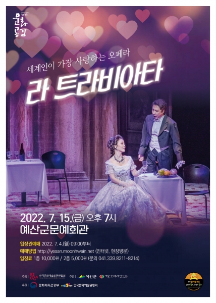 [충청뉴스큐] 예산군문예회관은 오는 7월 15일 금요일 저녁 7시 세계인이 가장 사랑하는 오페라이자 연인 사이의 비극적 사랑을 그린 오페라인 주세페 베르디의 ‘라 트라비아타’를 공연한다.