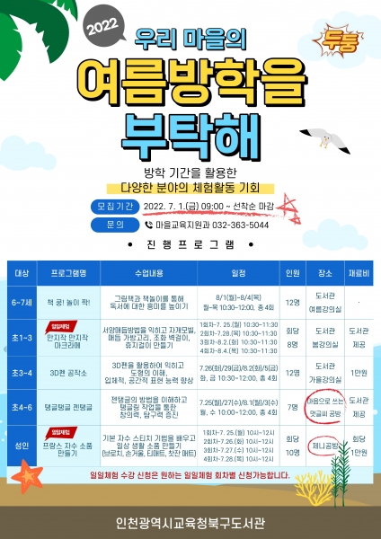 [충청뉴스큐] 인천광역시교육청북구도서관은 여름방학 기간 유아동, 성인 등 지역주민이 참여하는 ‘우리 마을의 여름방학을 부탁해’프로그램을 운영한다고 30일 밝혔다.