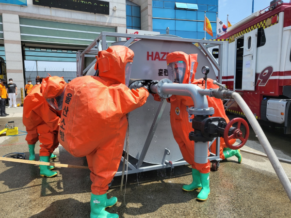 이번 교육훈련은 최근 증가하고 있는 화학사고 등 유해물질 사고의 효율적인 대응을 위해 자체 소방대원의 초기 대응능력을 향상하고 소방대원과의 유기적인 협력 강화를 위해 마련됐다.