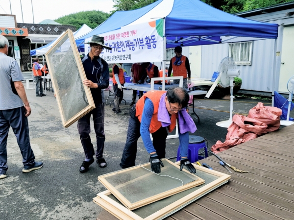 서천군귀농귀촌연구회 회원 30명은 이날 비인면 성산리 마을회관에 모여 6개 마을에서 수거한 노후 방충망을 교체·수선하면서 지역민과 소통하는 시간을 가졌다.