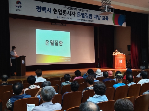 [충청뉴스큐] 평택시는 지난 6월 30일 폭염대비 온열질환 예방을 위해 시 소속 야외근로자 330명을 대상으로 남부문화예술회관 소공연장에서 평택시 산업보건의가 직접 폭염대비 온열질환 예방 및 대처방법에 대한 교육을 실시했다.