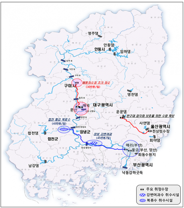 사업은 총 3가지로 구미 해평취수장에서 대구·경북에 일평균 30만t을 공급하기 위한 관로 45.2km 합천 황강 복류수와 창녕 강변여과수를 개발해 부산과 동부경남에 일평균 90만t을 공급하기 위한 취수시설 및 관로 102.2km 청도 운문댐에서 울산에 반구대암각화 보호를 위한 물량을 공급하기 위한 관로 43.8km를 건설한다는 내용이다.