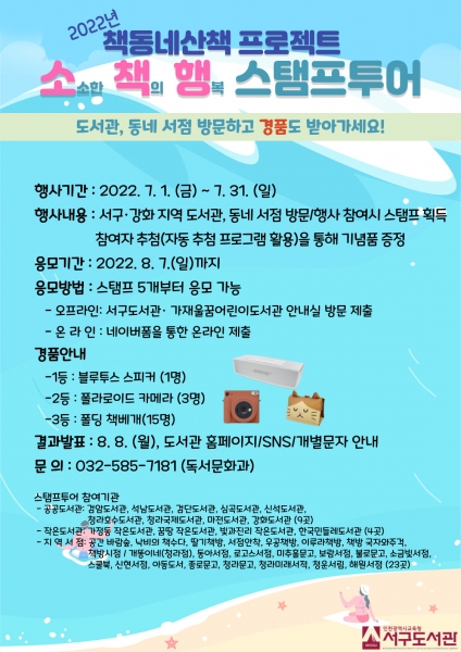 [충청뉴스큐] 인천광역시교육청서구도서관은 서구, 강화군 소재 도서관, 동네서점을 방문하거나 문화행사에 참여하면 스탬프를 찍어주는 2022년 ‘책동네산책 프로젝트’ 스탬프 투어 행사를 진행한다고 4일 밝혔다.