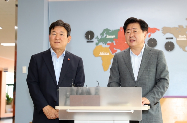 오영훈 도지사와 김광수 도교육감은 6일 오전 11시 30분 제주시 노형동 소재 한라중학교를 찾아 학교급식 현장 의견을 청취하고 이 같은 내용을 발표했다.
