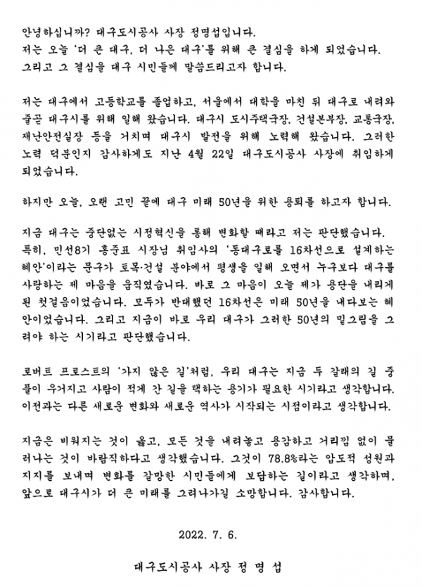 이날 사의를 표명한 정명섭 사장은 사퇴의 변에서 “지난 7월 1일 민선8기 홍준표 시장님의 ‘동대구로를 16차선으로 설계하는 혜안’이라는 취임사 문구를 접하고 평생을 토목·건설 분야에서 일해 온 사람으로서 모두가 반대했던 16차선이 미래 50년을 내다보는 혜안이었던 것처럼, 미래 50년 대구의 밑그림을 그리는 지금, 중단없는 시정혁신을 위해 모든 것을 내려놓고 물러나는 것이 변화를 갈망하는 시민들에게 보답하는 길이라고 생각한다”며 “앞으로 대구시가 더 큰 미래를 그려나가길 소망한다”고 밝혔다.