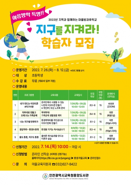 [충청뉴스큐] 인천광역시교육청중앙도서관은 26일부터 8월 12일까지 방학을 맞아 ‘여름방학 특명 지구를 지켜라’를 주제로 특강을 운영한다.