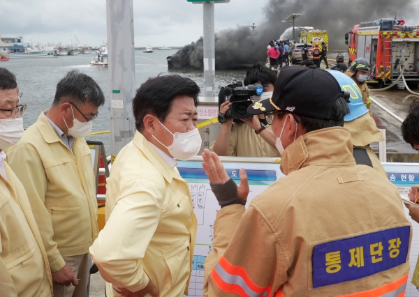 [충청뉴스큐] 오영훈 제주특별자치도지사는 7일 낮 12시 20분경 제주시 한림항 내 어선 화재사고 현장을 찾아 피해상황을 점검하고 화재피해자 및 실종자 가족에 대한 지원을 강조했다.