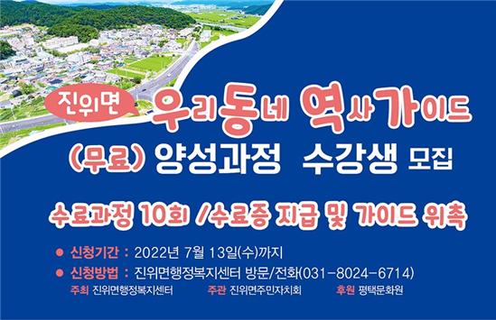 [충청뉴스큐] 평택시 진위면 주민자치회에서 2022년 주민참여예산사업으로 ‘진위면 우리동네 역사가이드’를 양성키로 하고 6월 27일부터 7월 13일까지 교육과정에 참여할 수강생을 모집하고 있다.